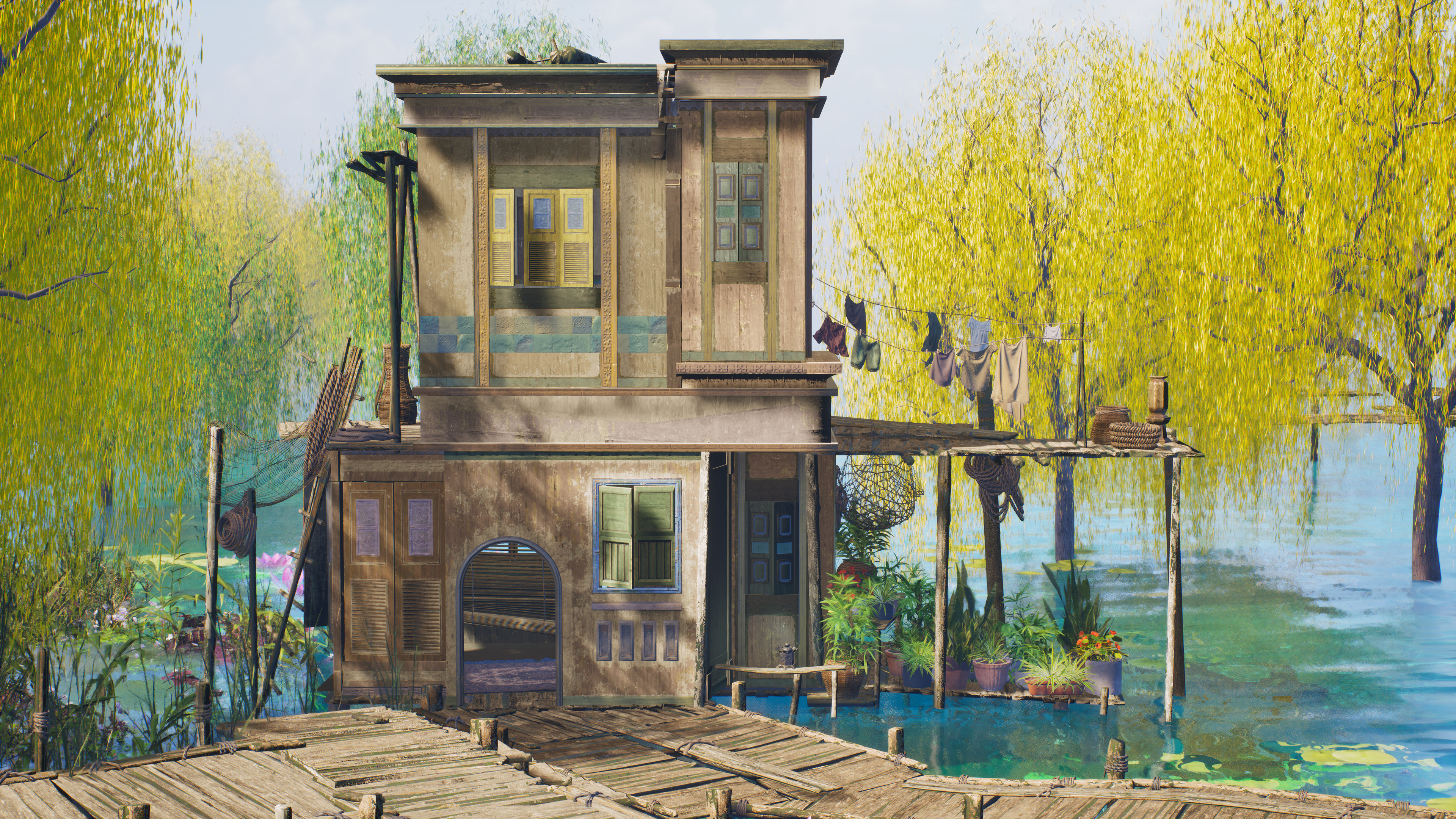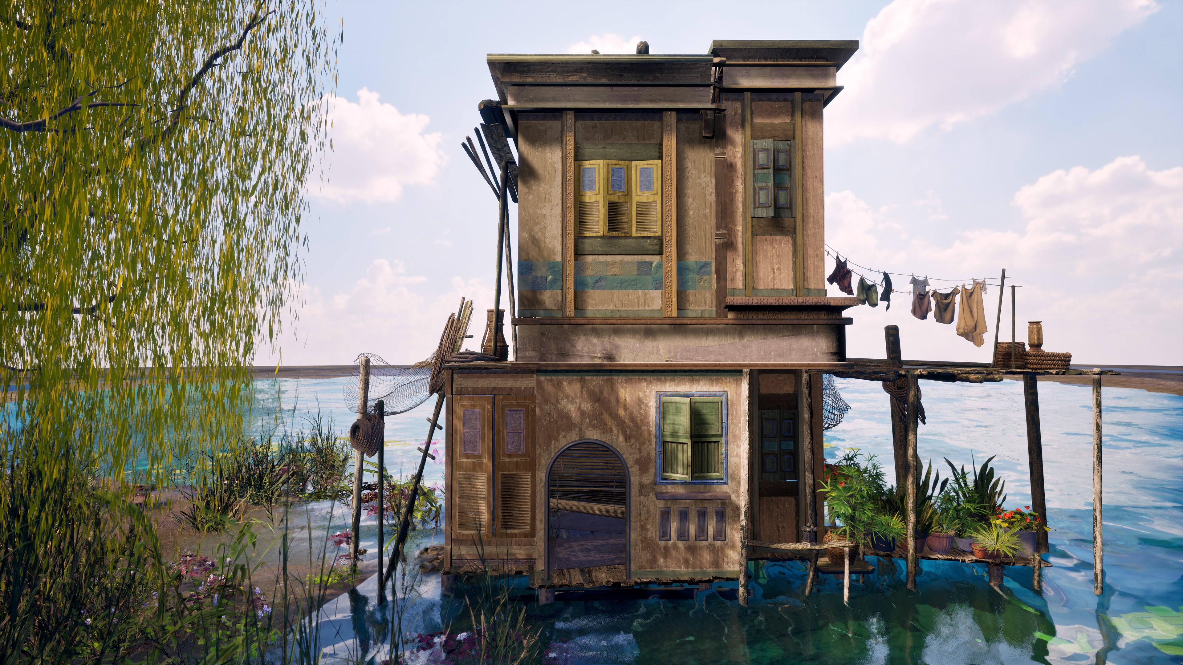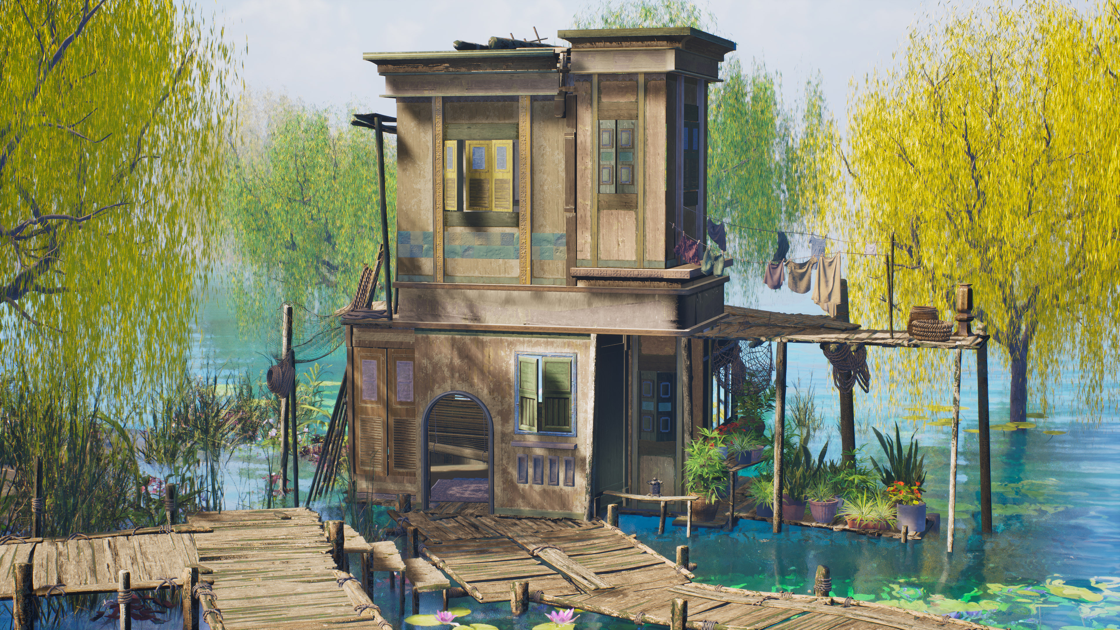building assets, swamp landscape, and lighting (HDRI) are on different levels (always streaming )for management
