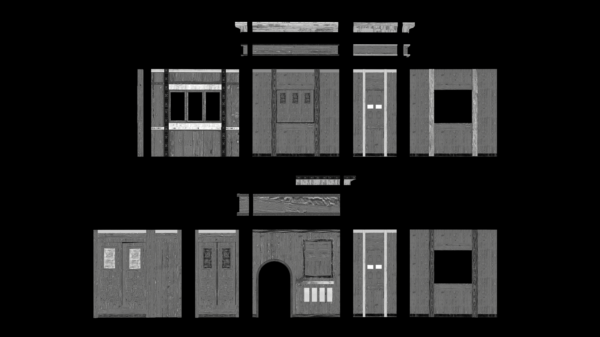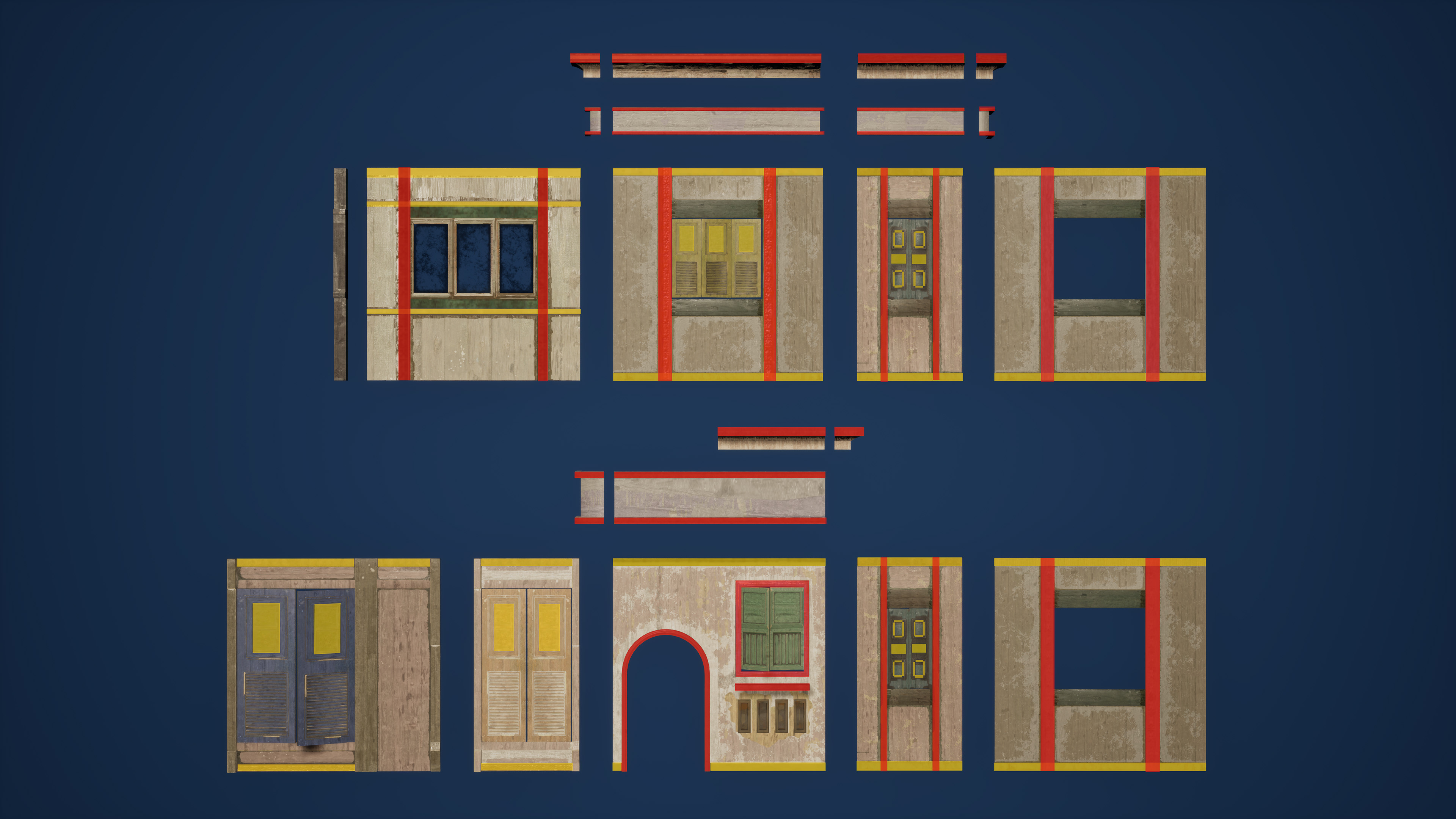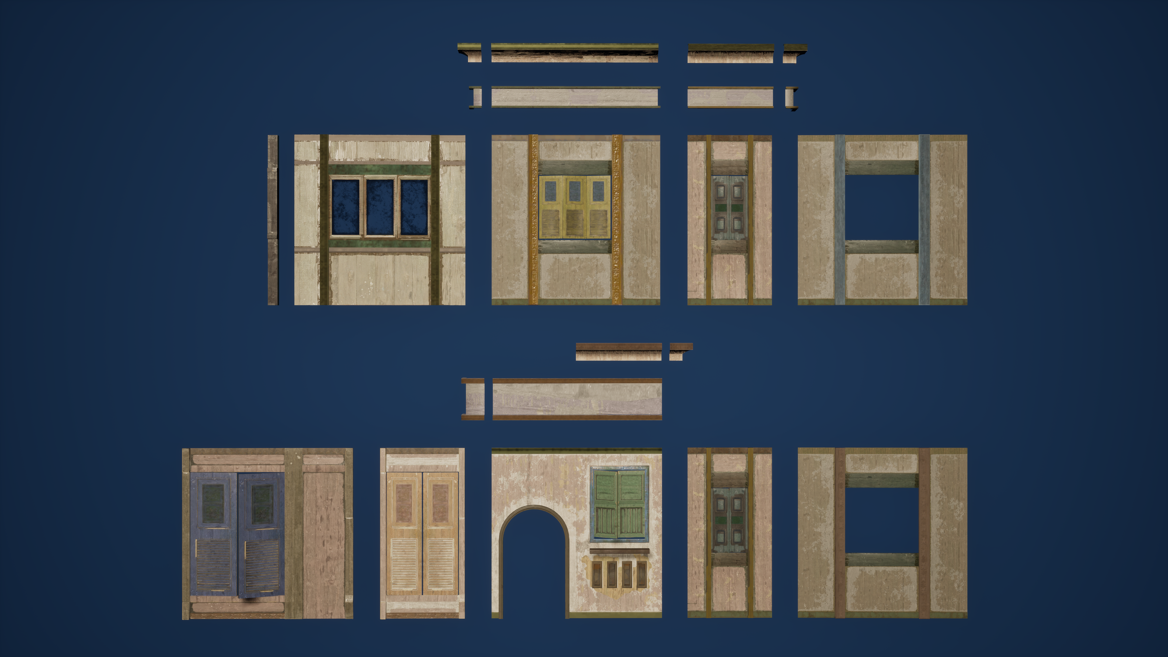 After research and sketching, I created a modular kit for this swamp village project. Highlighting designs on decorative trims and overhanging molding (Islamic), as well as creating a more dynamic modular kit for different building and stacking purposes. All of this is to follow my first draft of design (scroll down to see more)