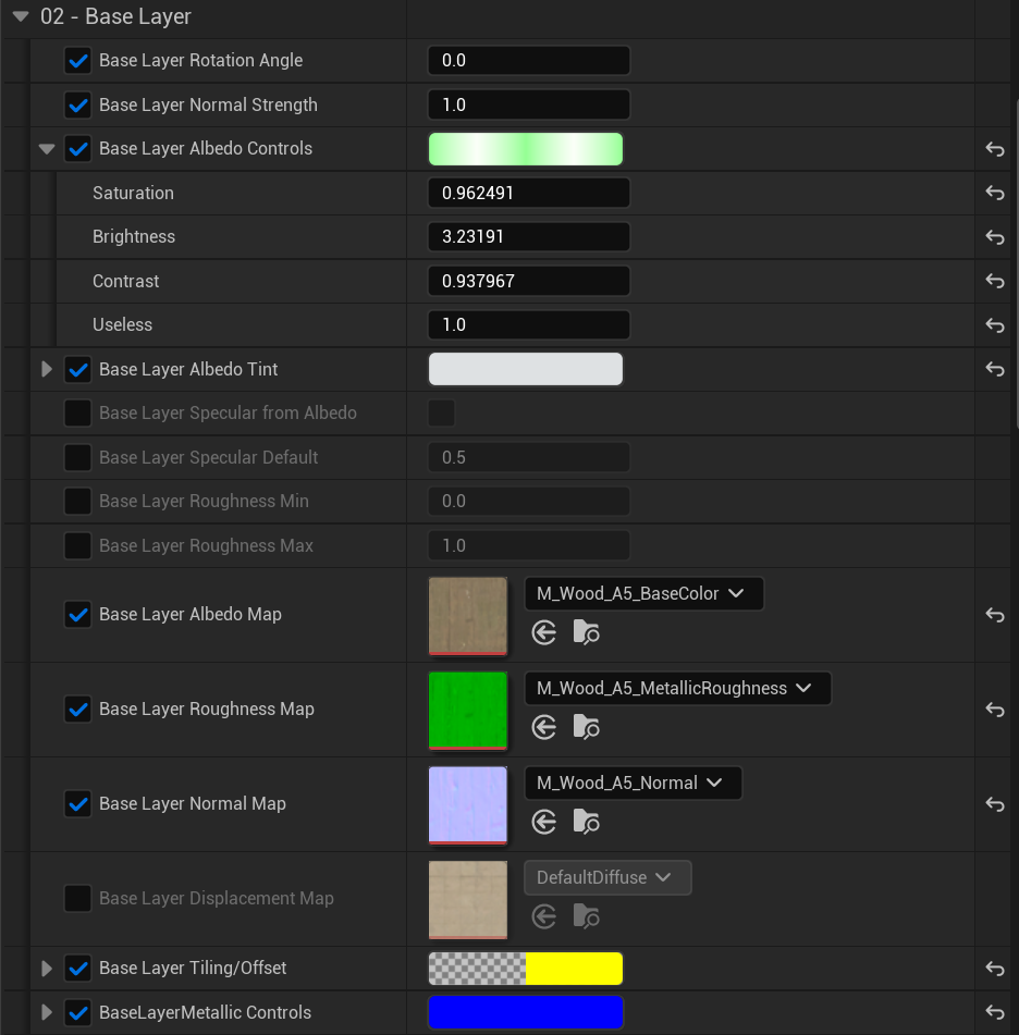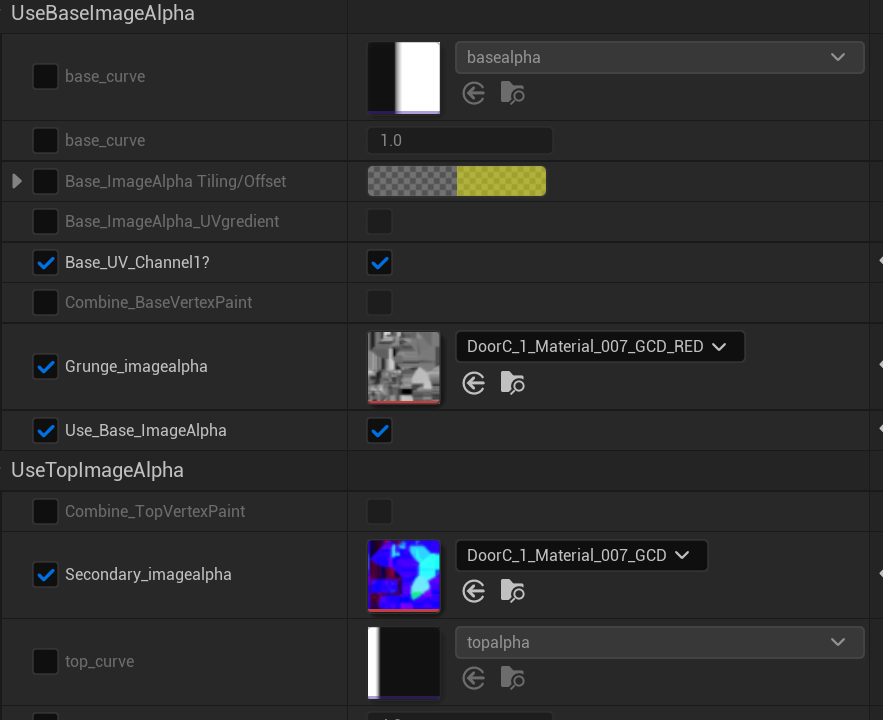 the master material and following material functions were created following tutorials by MOZTIFY, with added modification to fit my own personal gaming asset workflow. As you can see down below, this door material calls the same texture in each layer but with albedo parameter and tint parameter to alter overall look.
